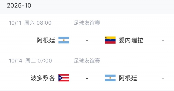 阿根廷将于10月11日对阵委内瑞拉,在14日对阵委内瑞拉。